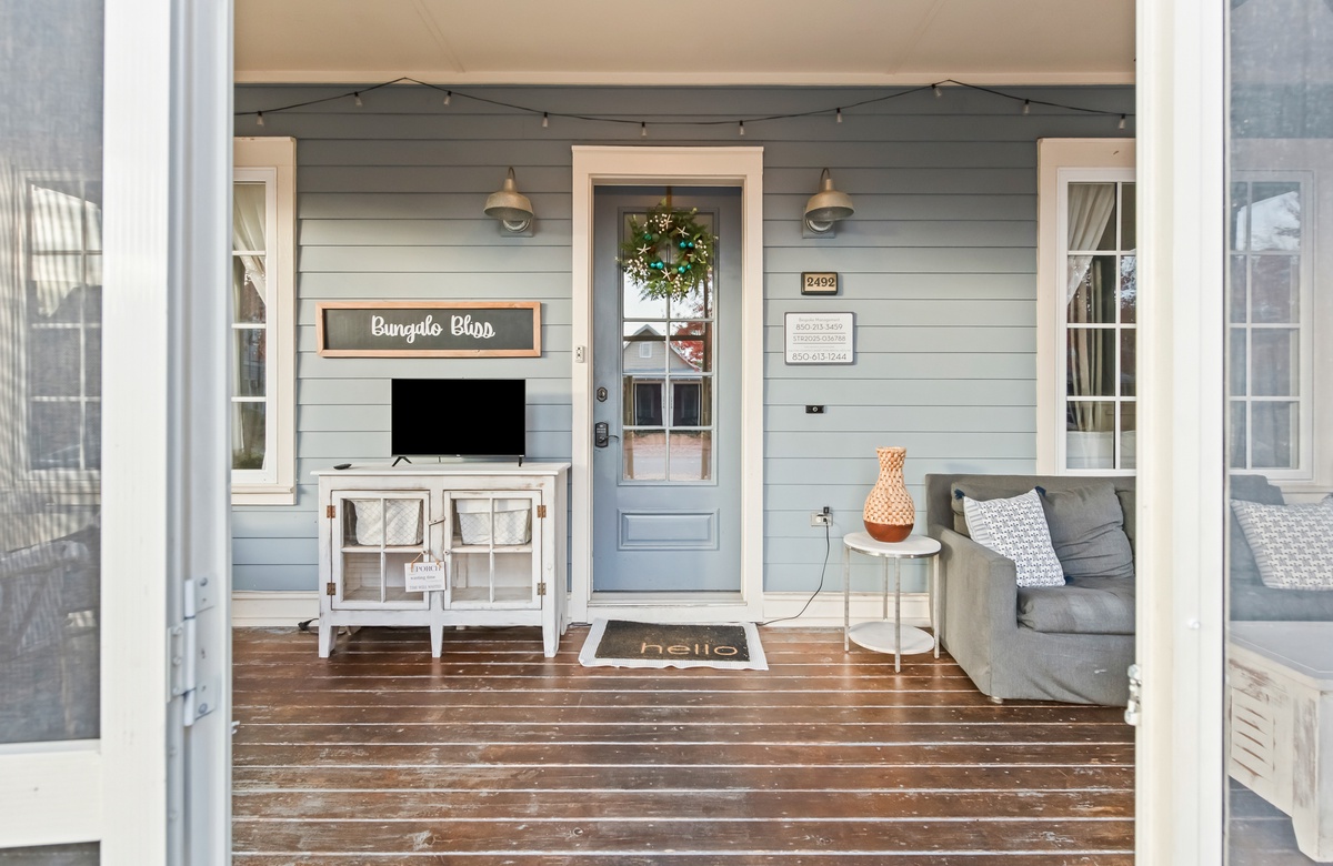 - The front door is equipped with a ring doorbell camera inside the screened in porch