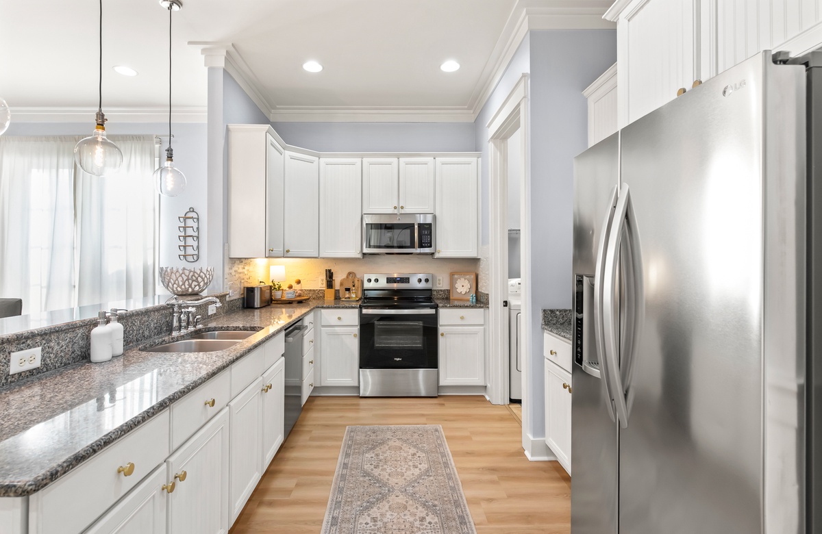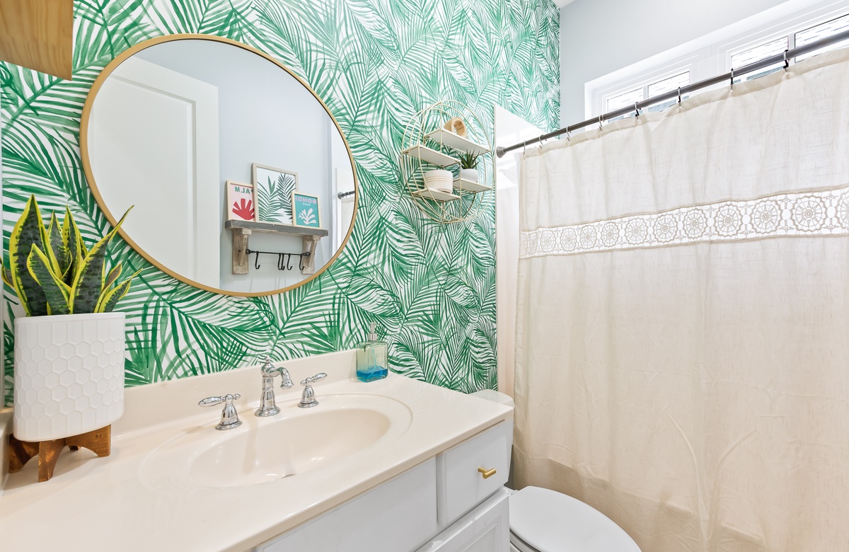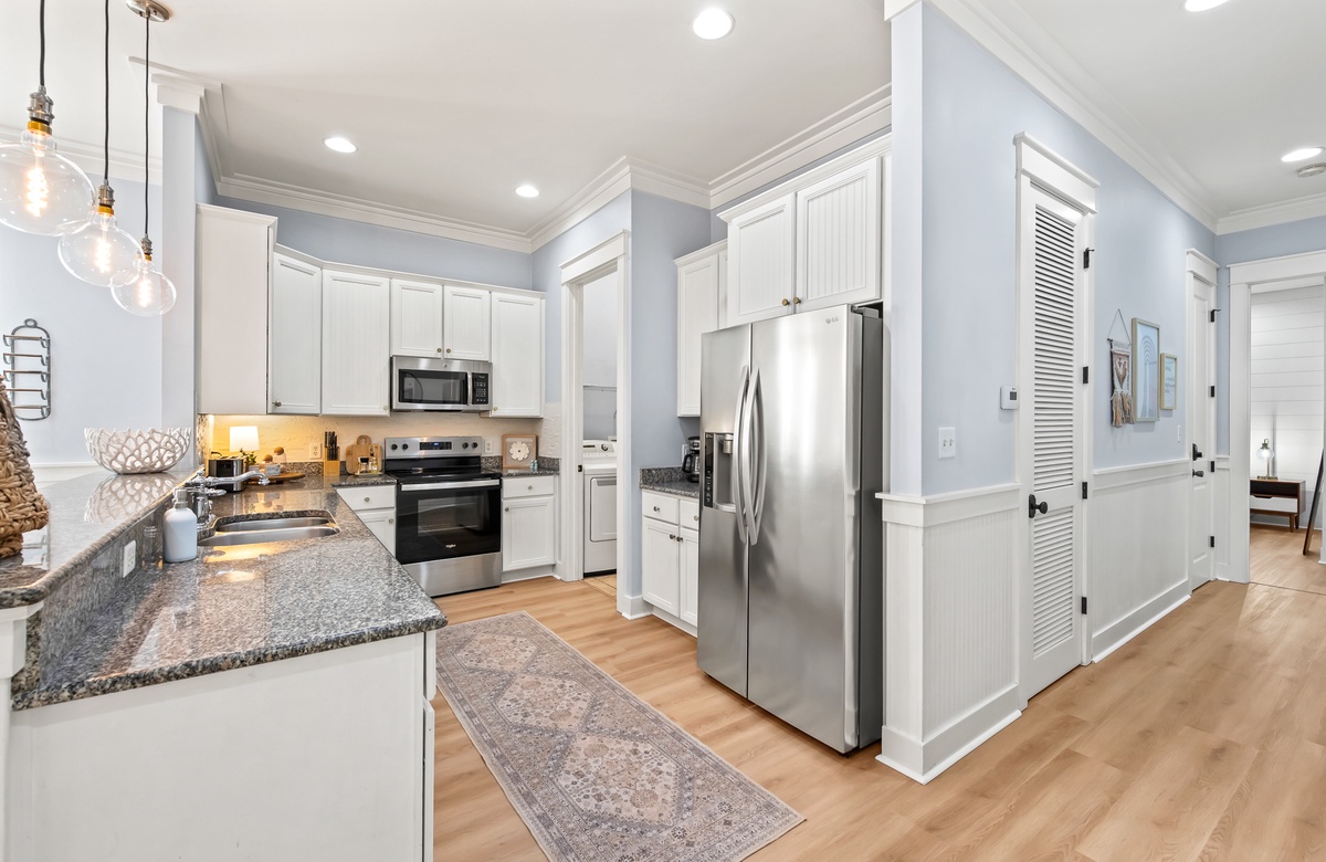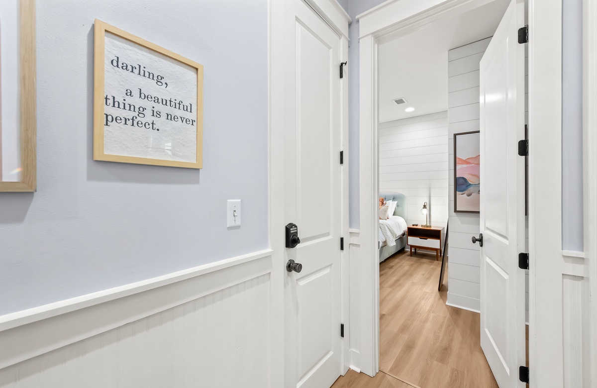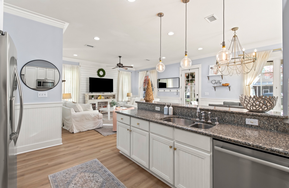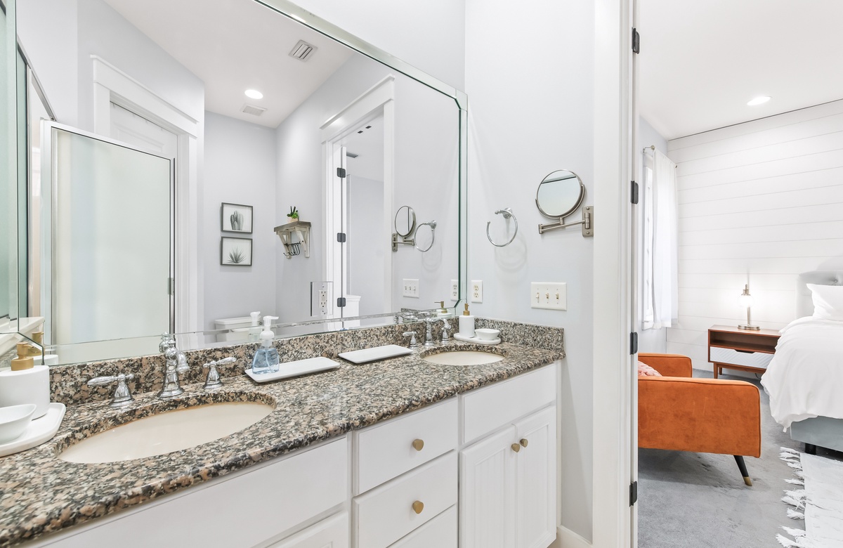 Enter through a large, screened porch with plenty of outdoor seating, a hammock and TV. Upon entering you are greeted with a full-size kitchen, granite countertops and stainless-steel appliances. There is a dining area with seating for 6 that opens into a cozy living area. The master bedroom features a king bed, shiplap feature wall, smart TV, and private attached bathroom with a walk-in closet and shower. The guest bedroom has been updated with a king bed and shares a bathroom with two twin beds in the guest room down the hall.