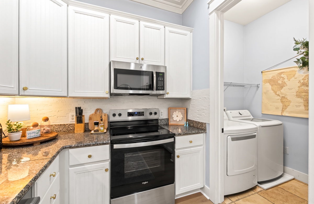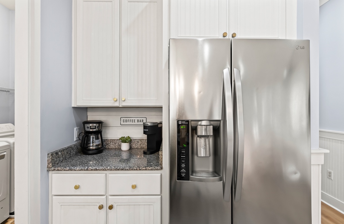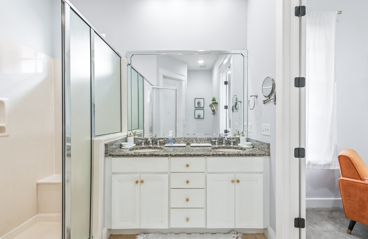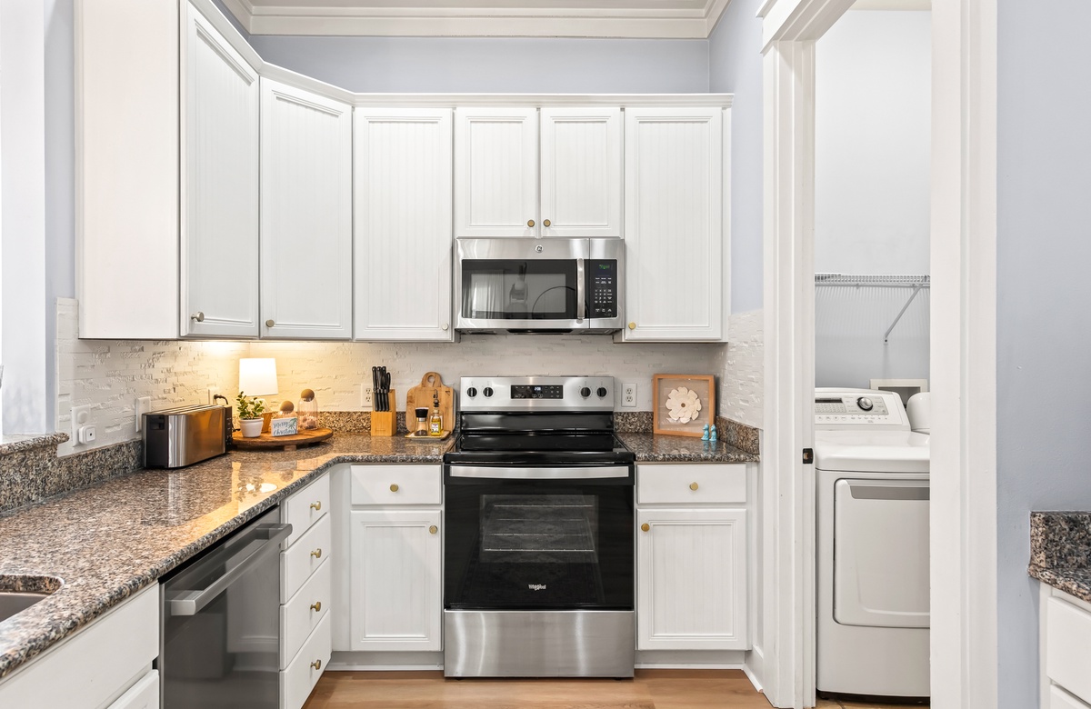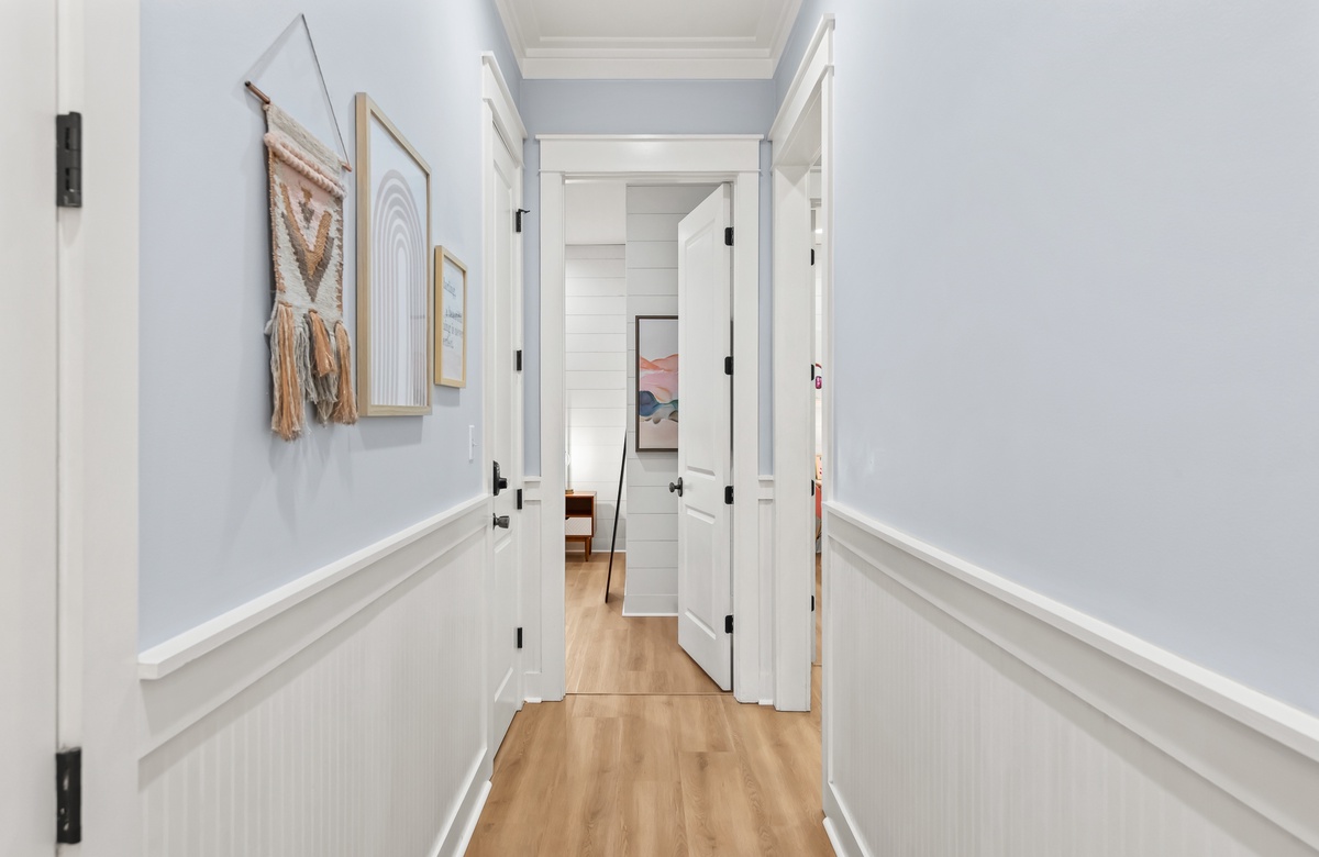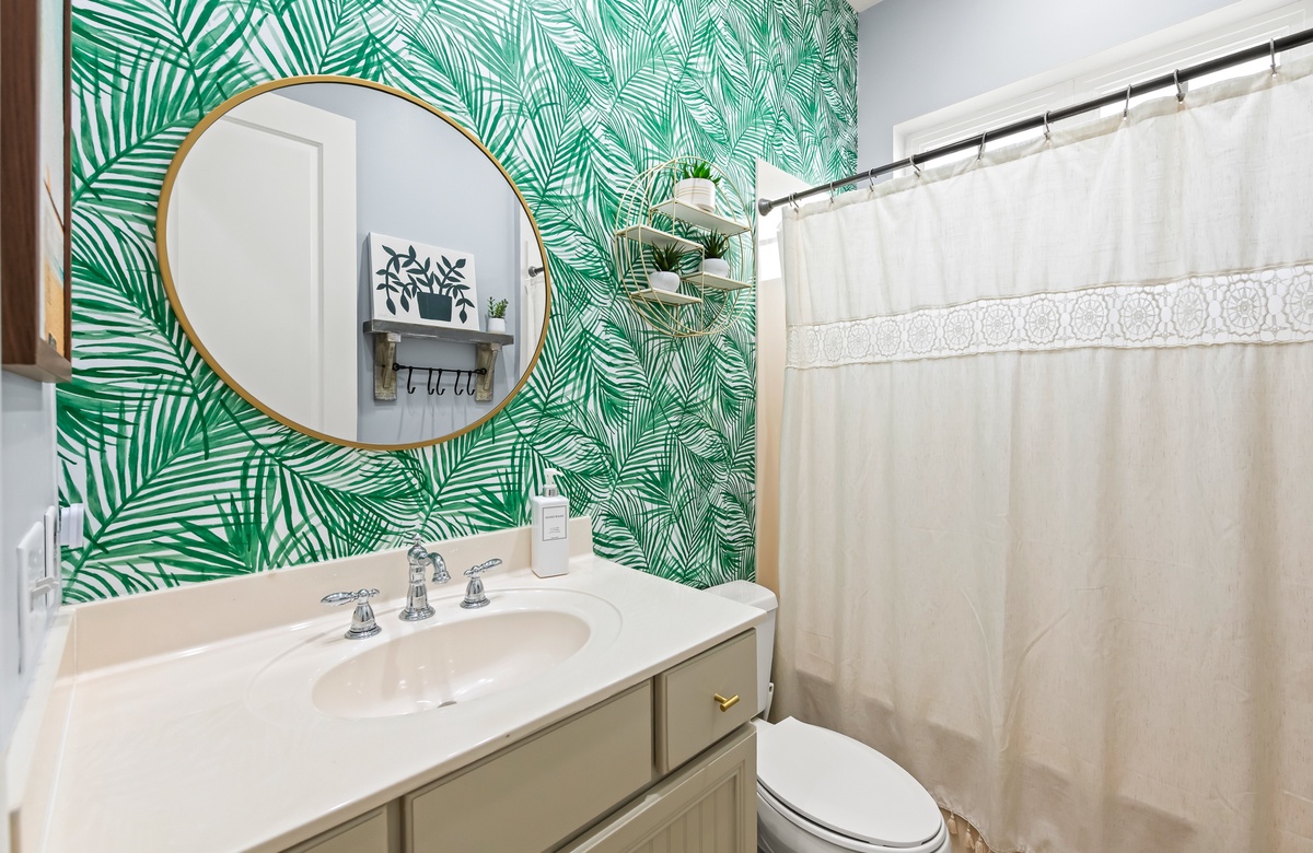 Enter through a large, screened porch with plenty of outdoor seating, a hammock and TV. Upon entering you are greeted with a full-size kitchen, granite countertops and stainless-steel appliances. There is a dining area with seating for 6 that opens into a cozy living area. The master bedroom features a king bed, shiplap feature wall, smart TV, and private attached bathroom with a walk-in closet and shower. The guest bedroom has been updated with a king bed and shares a bathroom with two twin beds in the guest room down the hall.