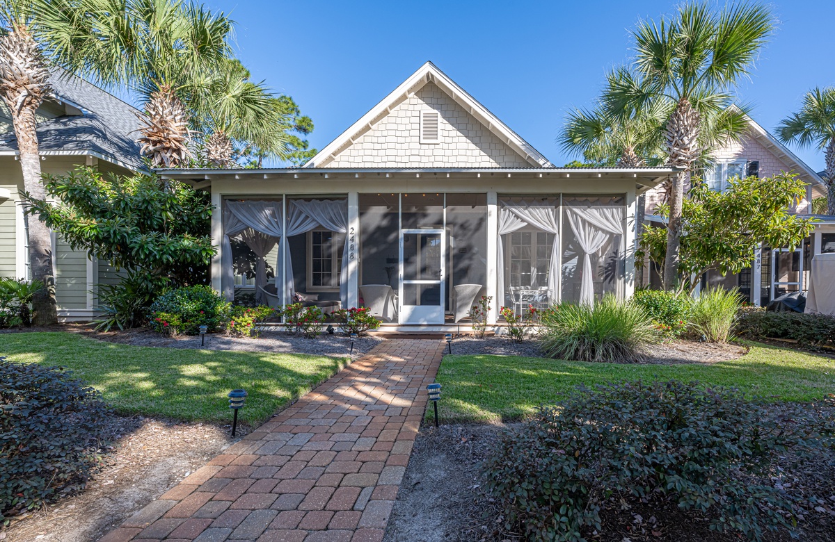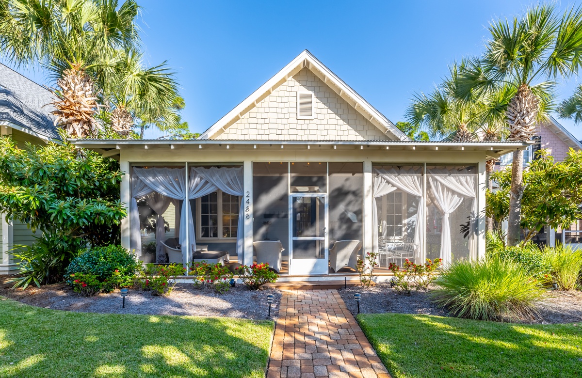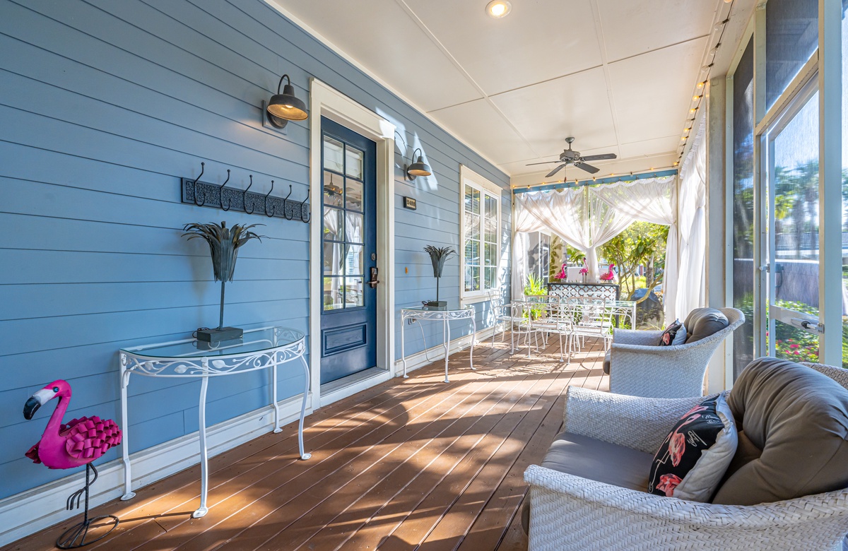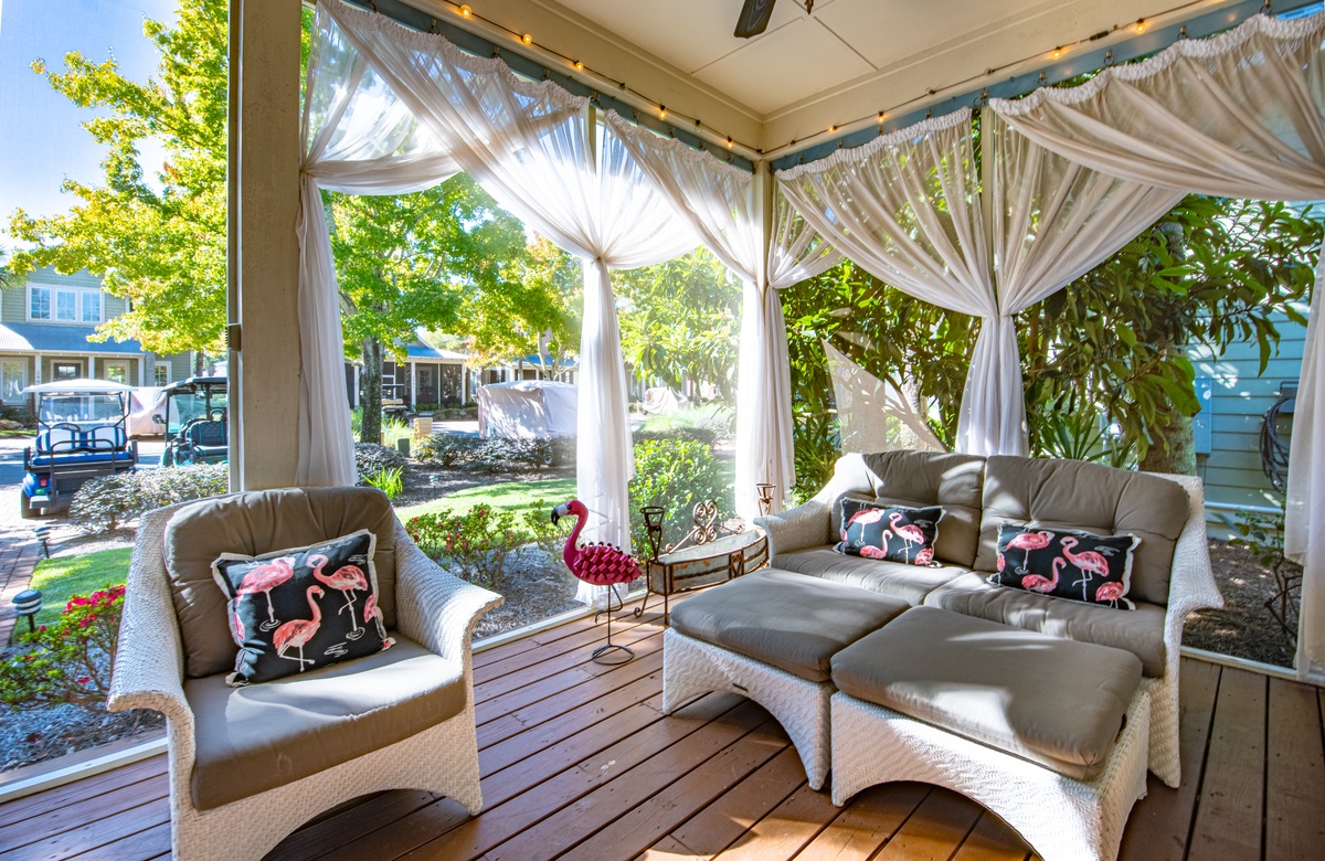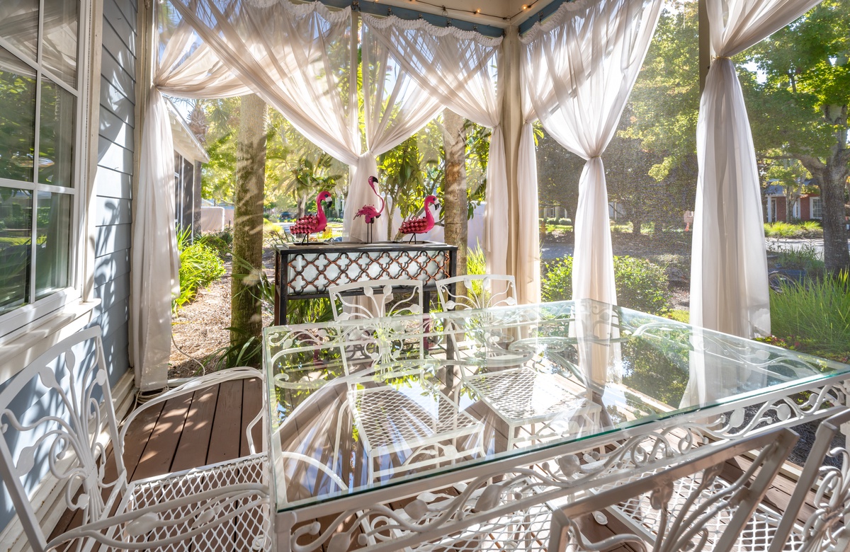 The all-ground-level house’s crown jewel is the gorgeous screened front porch with beautiful canopy drapes, where you can relax on the high-end outdoor furniture. The spacious area also features a lovely wrought iron patio table, perfect for taking in alfresco meals prepared in the full kitchen which features quartz countertops and stainless-steel appliances. The interior does a masterful job of blending elegant furnishings with vibrant pops of color. There is a dining area with seating for 9 that opens up into a cozy living area. The master bedroom features a king bed, smart TV, and private attached bathroom with a walk-in closet and shower. The guest bedroom has been updated with a queen bed and shares a bathroom with two bunk beds in the guest room down the hall. Additional perks include complimentary WiFi, central air-conditioning, and a private washer/dryer.