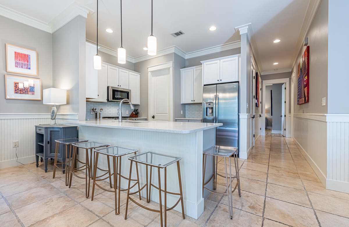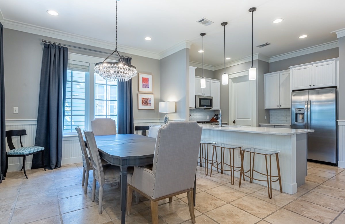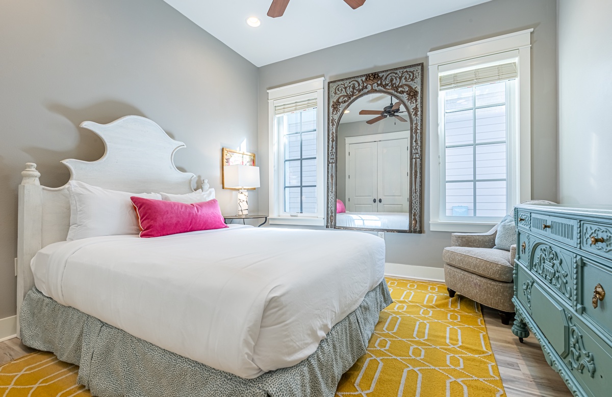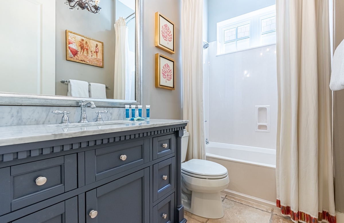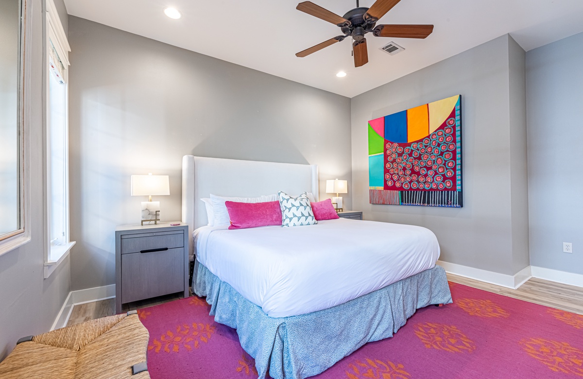 The all-ground-level house’s crown jewel is the gorgeous screened front porch with beautiful canopy drapes, where you can relax on the high-end outdoor furniture. The spacious area also features a lovely wrought iron patio table, perfect for taking in alfresco meals prepared in the full kitchen which features quartz countertops and stainless-steel appliances. The interior does a masterful job of blending elegant furnishings with vibrant pops of color. There is a dining area with seating for 9 that opens up into a cozy living area. The master bedroom features a king bed, smart TV, and private attached bathroom with a walk-in closet and shower. The guest bedroom has been updated with a queen bed and shares a bathroom with two bunk beds in the guest room down the hall. Additional perks include complimentary WiFi, central air-conditioning, and a private washer/dryer.