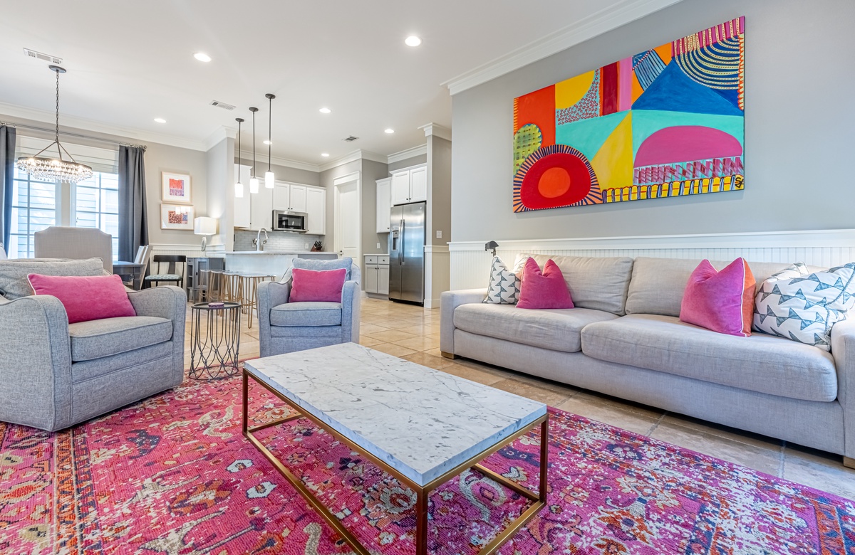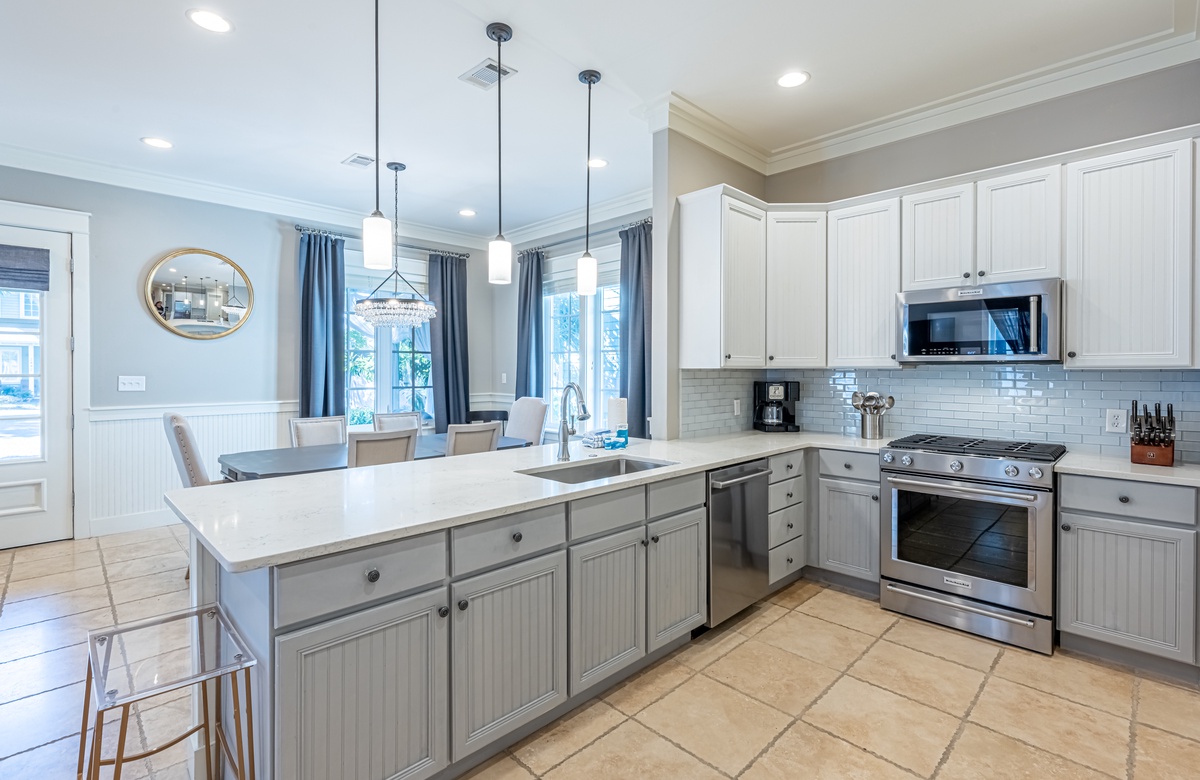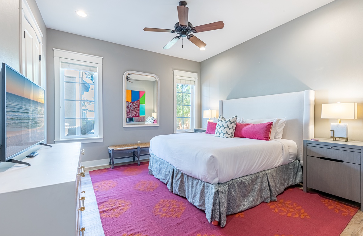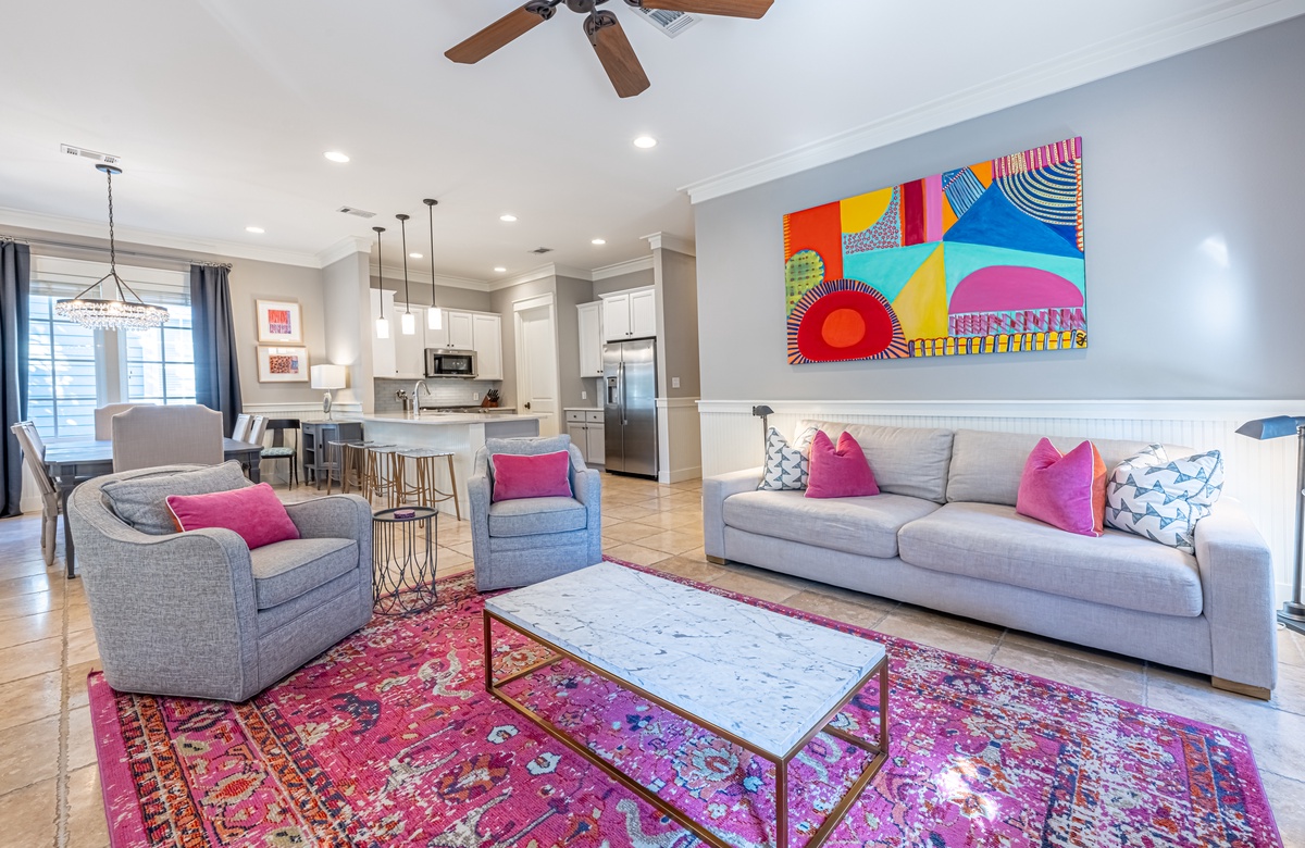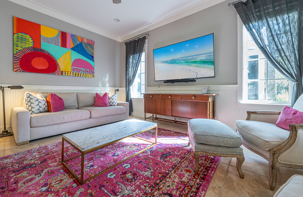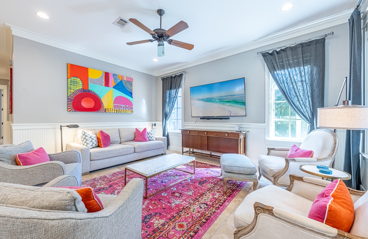 The all-ground-level house’s crown jewel is the gorgeous screened front porch with beautiful canopy drapes, where you can relax on the high-end outdoor furniture. The spacious area also features a lovely wrought iron patio table, perfect for taking in alfresco meals prepared in the full kitchen which features quartz countertops and stainless-steel appliances. The interior does a masterful job of blending elegant furnishings with vibrant pops of color. There is a dining area with seating for 9 that opens up into a cozy living area. The master bedroom features a king bed, smart TV, and private attached bathroom with a walk-in closet and shower. The guest bedroom has been updated with a queen bed and shares a bathroom with two bunk beds in the guest room down the hall. Additional perks include complimentary WiFi, central air-conditioning, and a private washer/dryer.