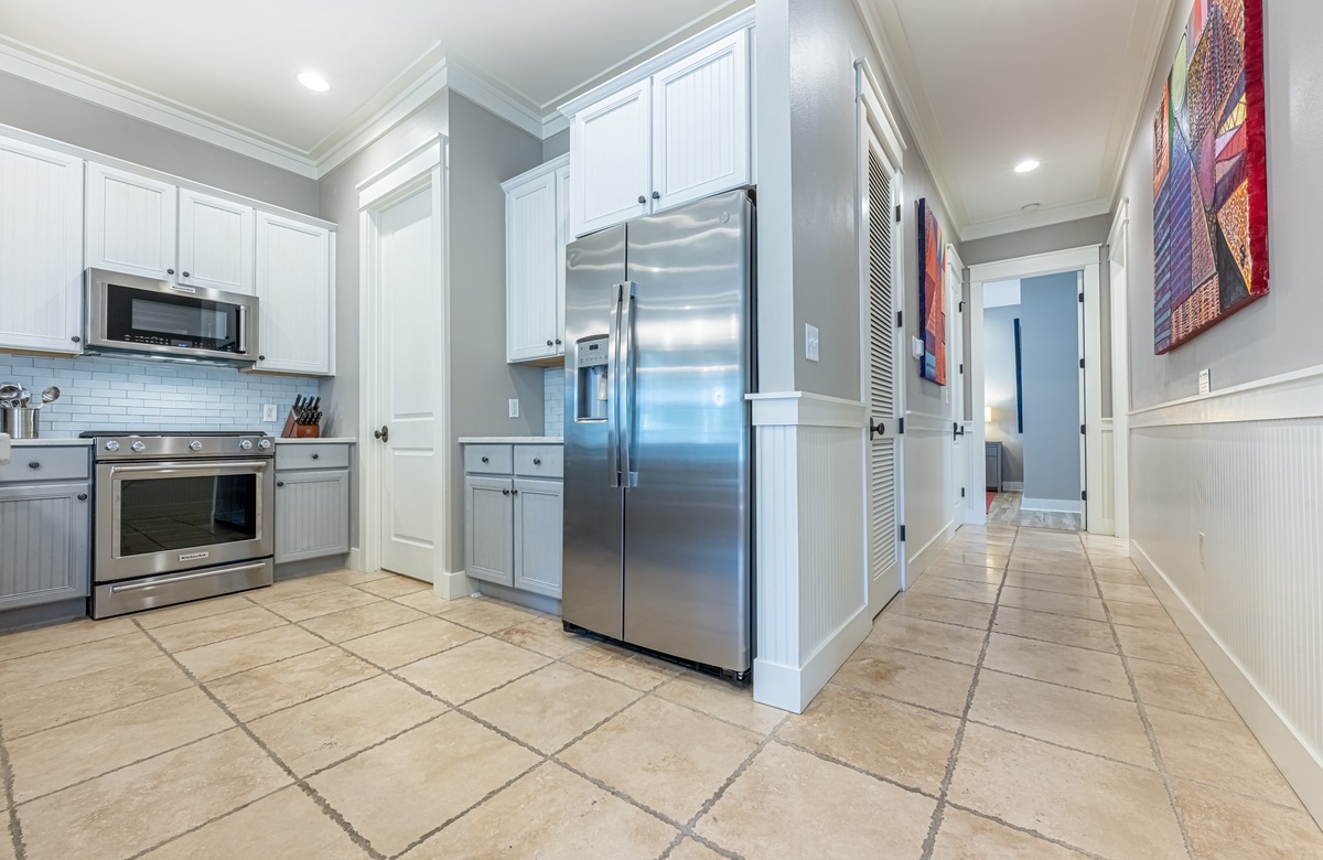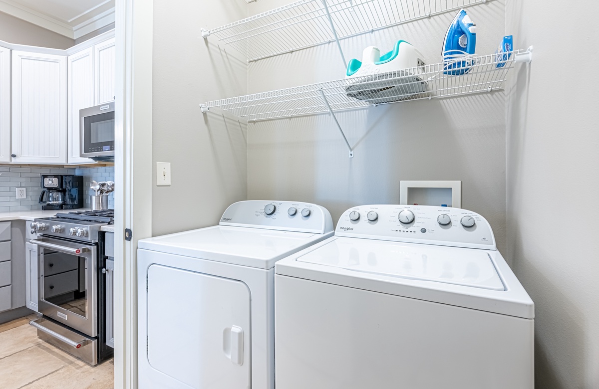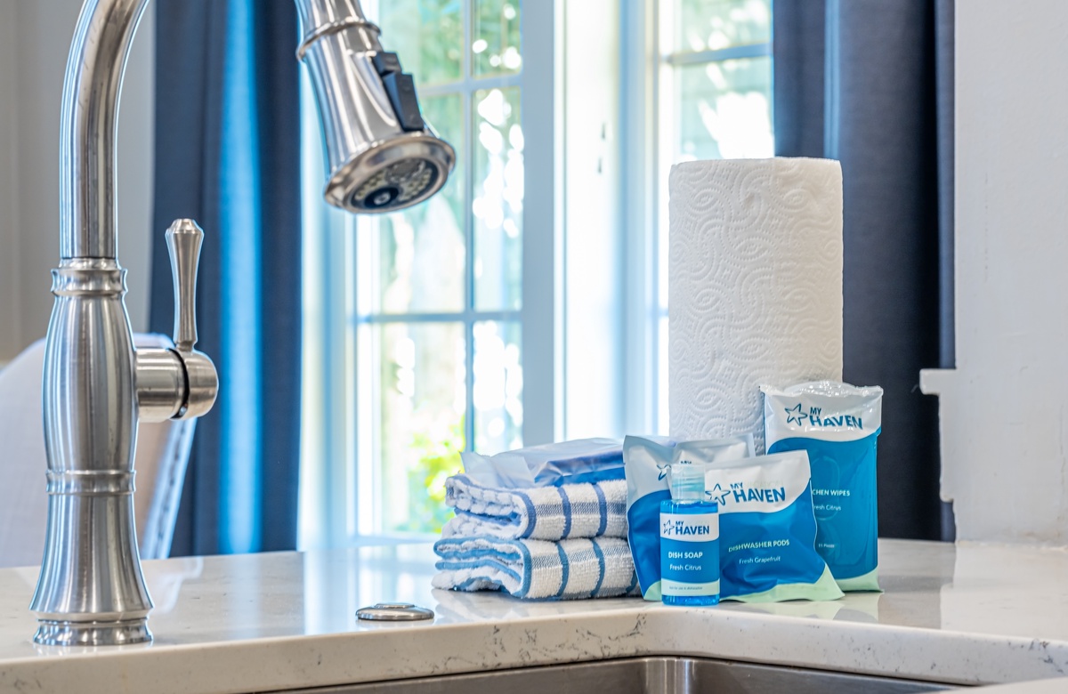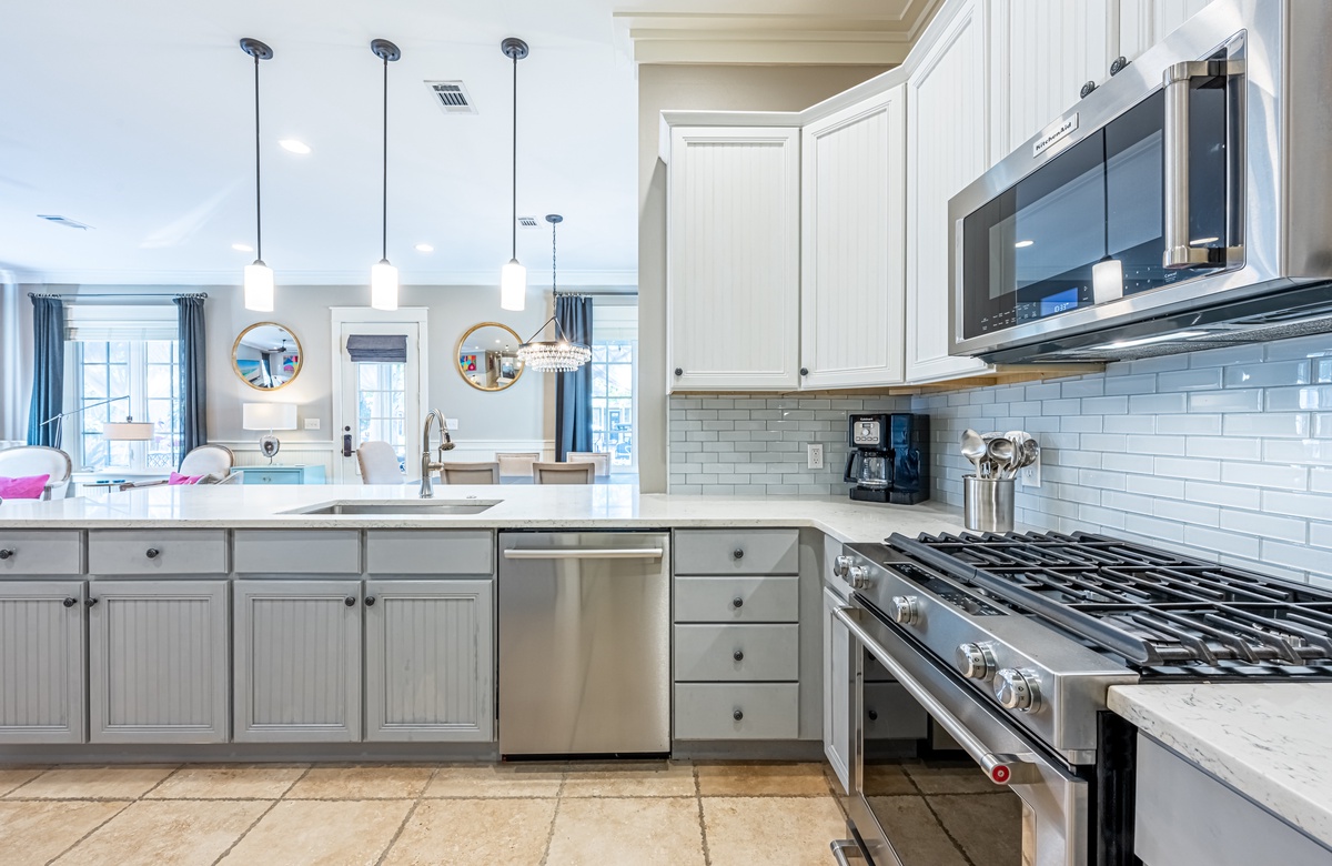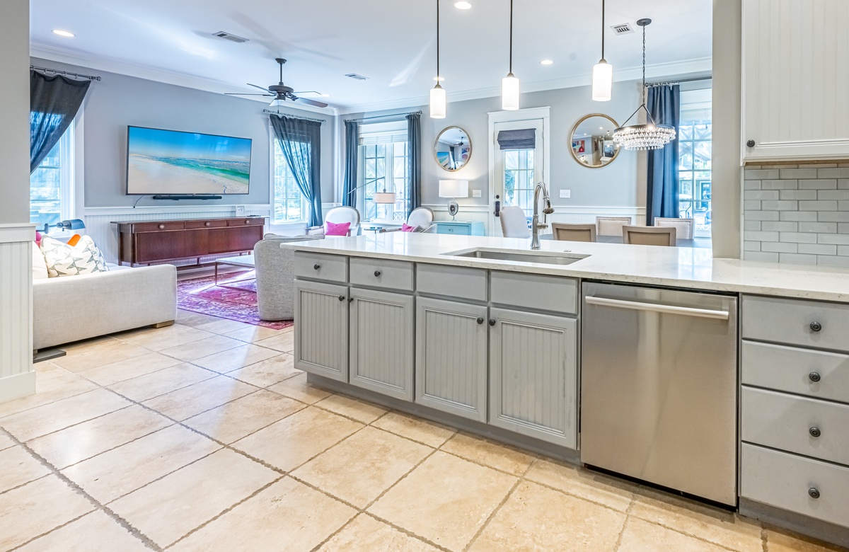 The all-ground-level house’s crown jewel is the gorgeous screened front porch with beautiful canopy drapes, where you can relax on the high-end outdoor furniture. The spacious area also features a lovely wrought iron patio table, perfect for taking in alfresco meals prepared in the full kitchen which features quartz countertops and stainless-steel appliances. The interior does a masterful job of blending elegant furnishings with vibrant pops of color. There is a dining area with seating for 9 that opens up into a cozy living area. The master bedroom features a king bed, smart TV, and private attached bathroom with a walk-in closet and shower. The guest bedroom has been updated with a queen bed and shares a bathroom with two bunk beds in the guest room down the hall. Additional perks include complimentary WiFi, central air-conditioning, and a private washer/dryer.