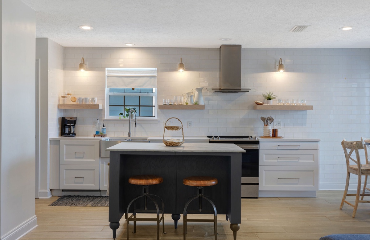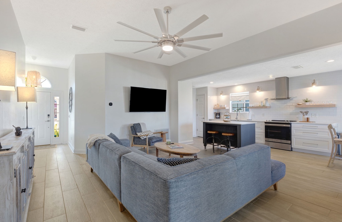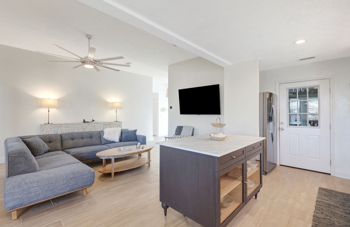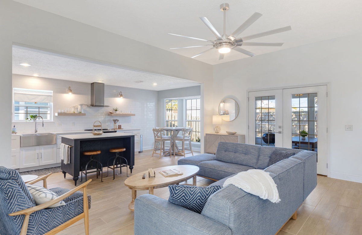 As you enter the home, the first two guest bedrooms are on the right side of the home. These two rooms share a full bathroom. The living room offers plenty of comfortable seating to play boardgames or watch a movie. The open kitchen and dining area are greeted with plenty of natural light which will engulf you in the evenings as you enjoy a meal together.