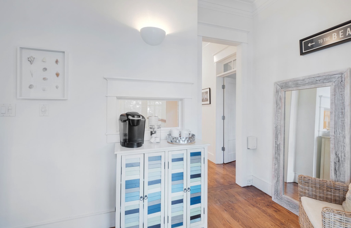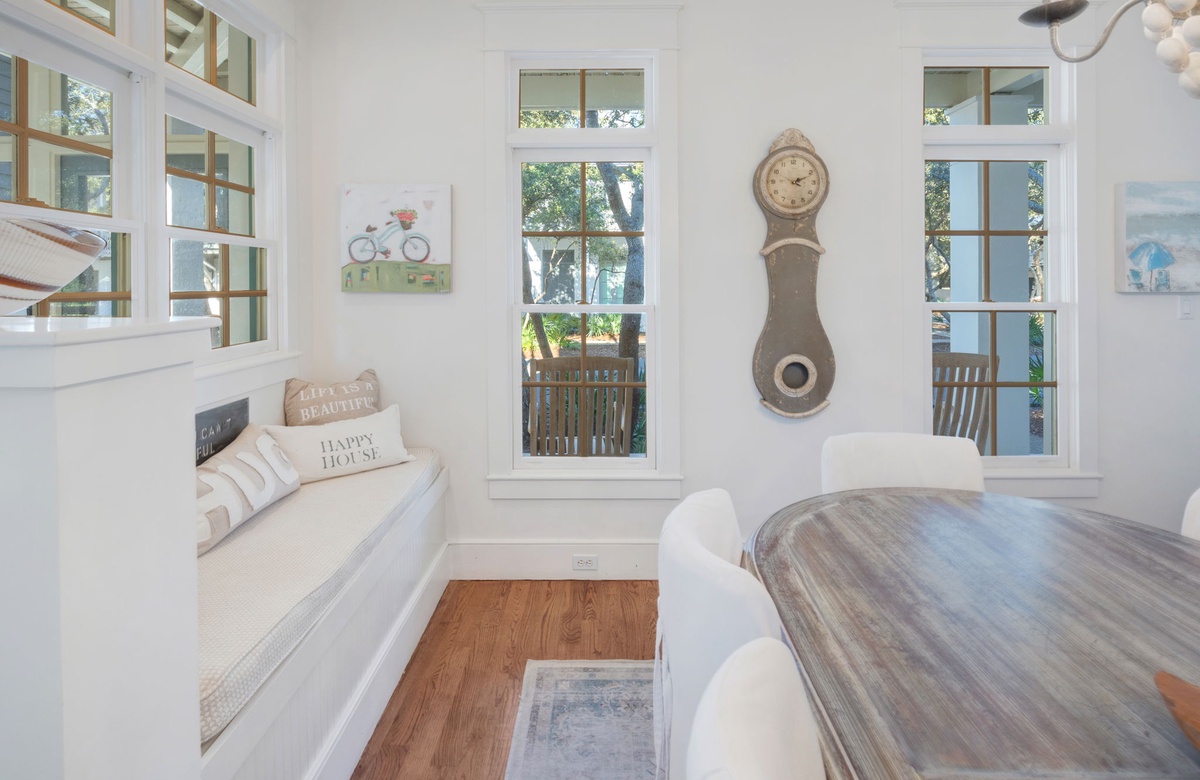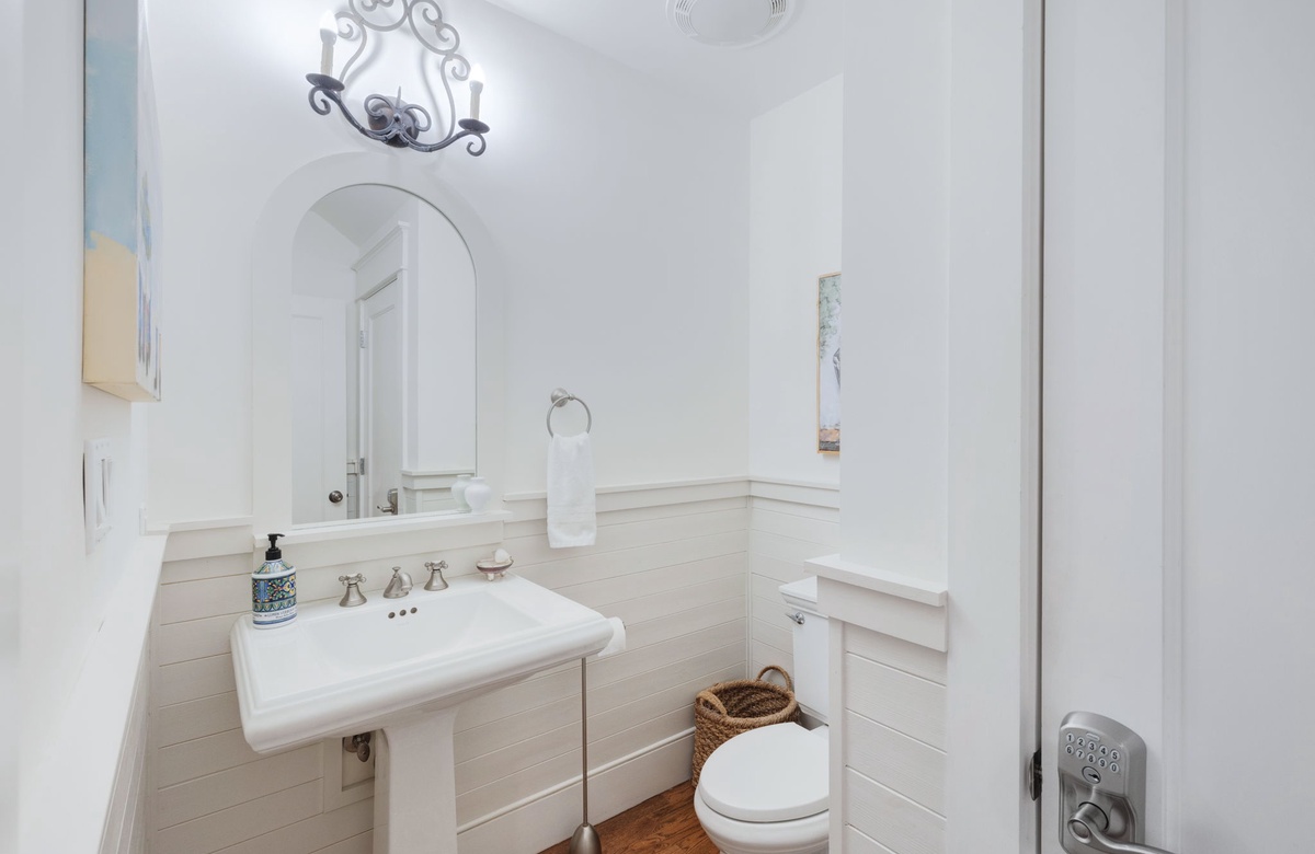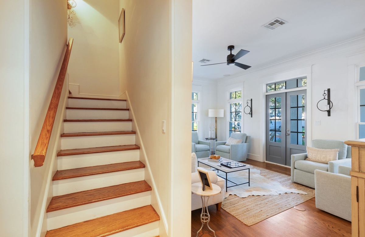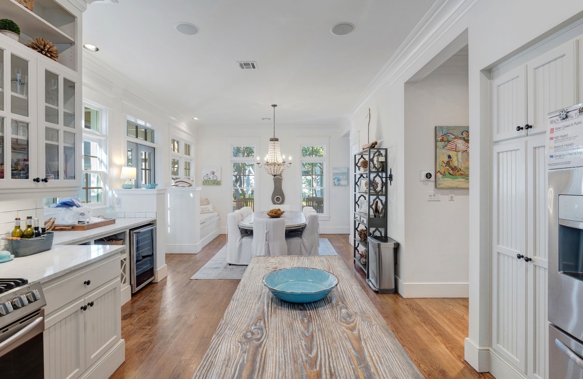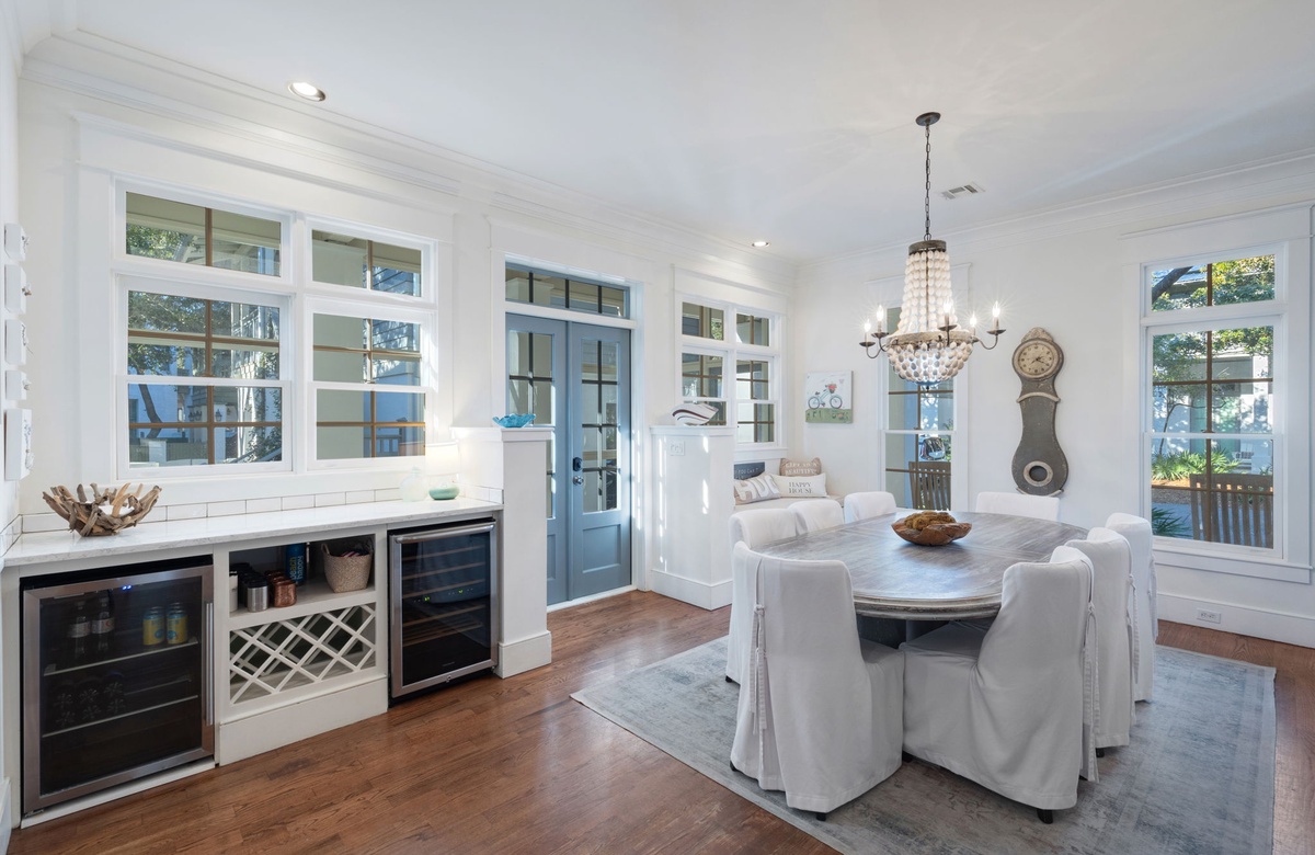 As you approach The Beach House you will be welcomed by the grand entrance featuring a wrap-around porch lined with an abundance of rocking chairs and beautiful gas-lit sconces. Feel free to sit down and soak it all in, your vacation of a lifetime is about to begin. After walking through the beautiful dark wood French-style doors you will enter the lower-level living chamber. This room is packed with comfortable couches and chairs, lovely decor, and wall-to-wall windows, offering a perfect place to unwind with a book, sip your morning coffee, or watch a movie with family. Taking the hall just past the living chamber leads you past the half bathroom, which is both clean and cozy, to the open-concept kitchen and dining room. This space is filled with natural light, access to the screened back porch, painted beautifully white like the rest of the home, contrasting the hardwood floors ever so lovely. The dining area features a large table with seating for eight underneath an extravagant chandelier, a comfortable window nook equipped with pillows for those early morning quiet times, and both a wine and beverage fridge for your enjoyment. The spacious kitchen comes with stainless steel appliances including a large double-door refrigerator, gas-top oven, and microwave. The kitchen also offers a plethora of cooking and dinnerware for your cooking and dining needs. It has been said that the fondest memories are created around the dinner table and the design of this space at The Beach House curates just that.