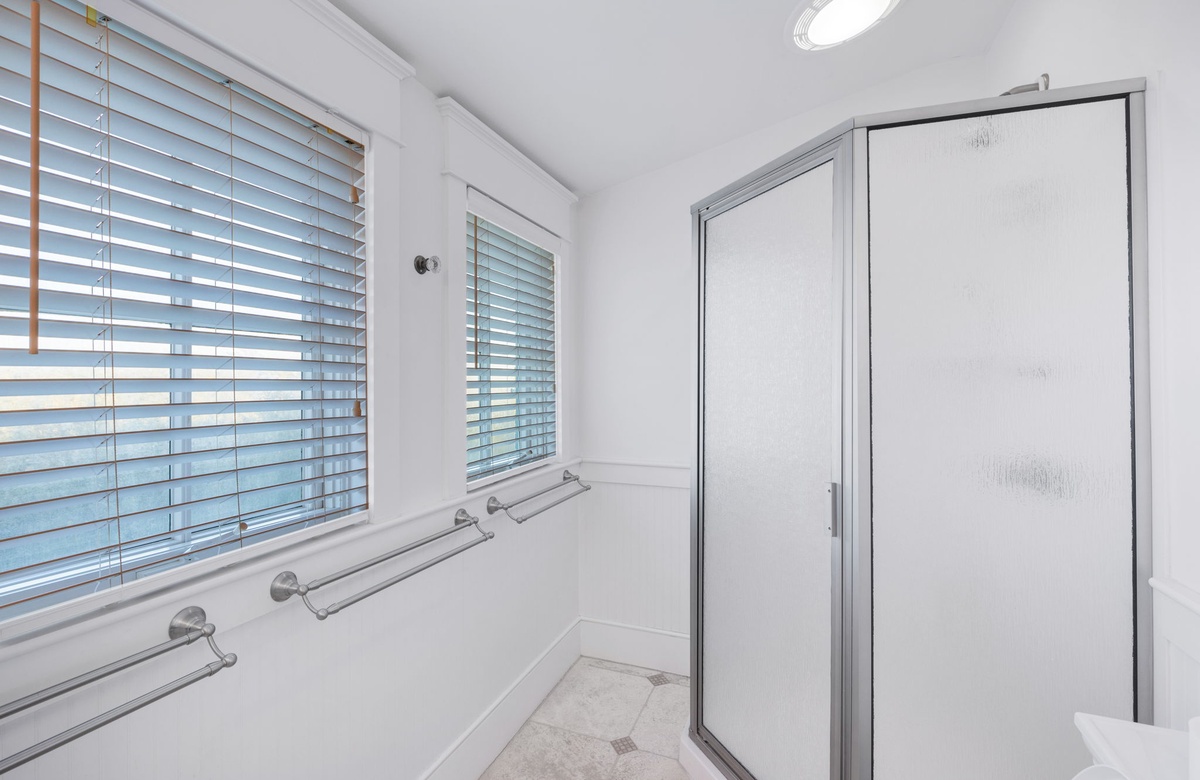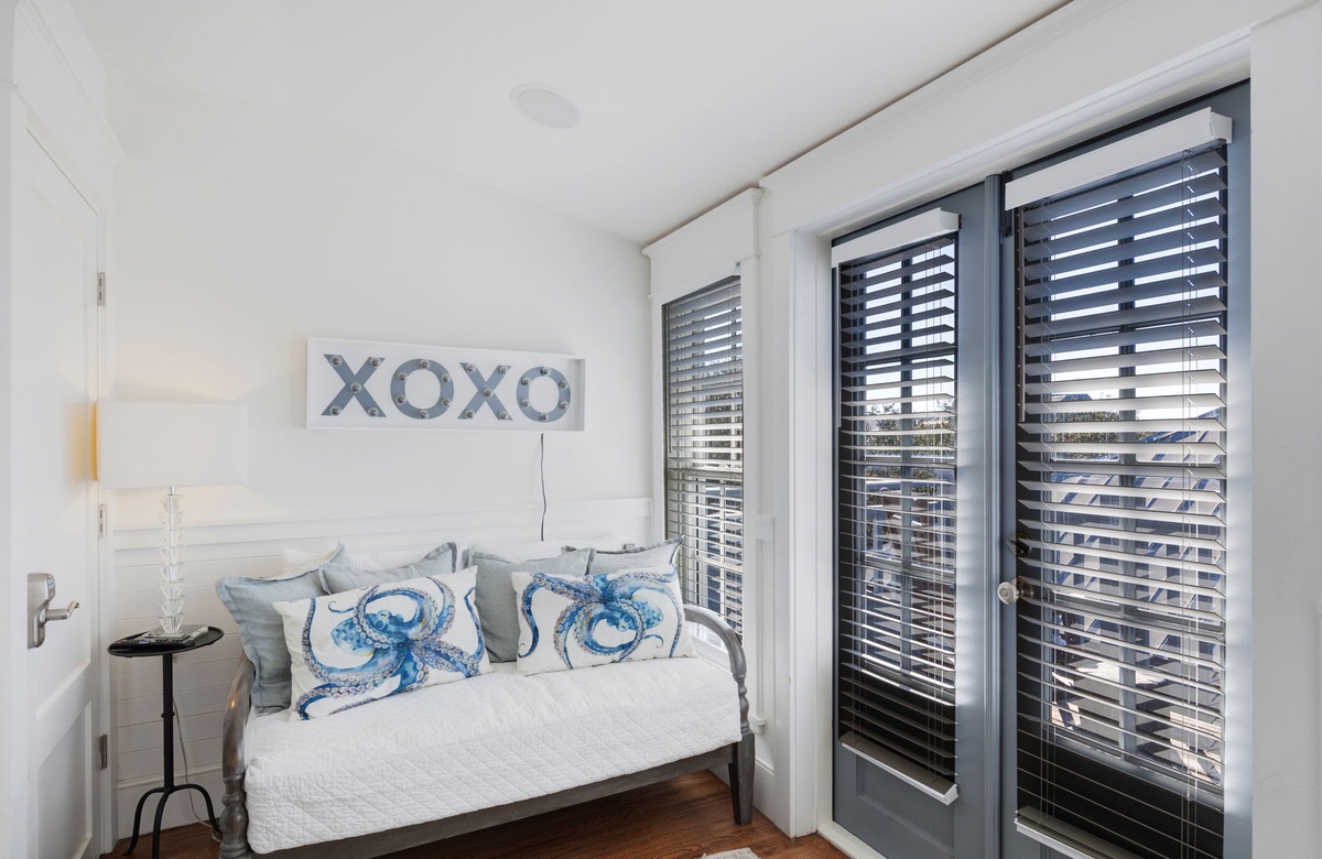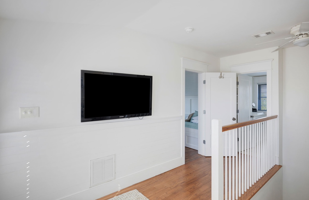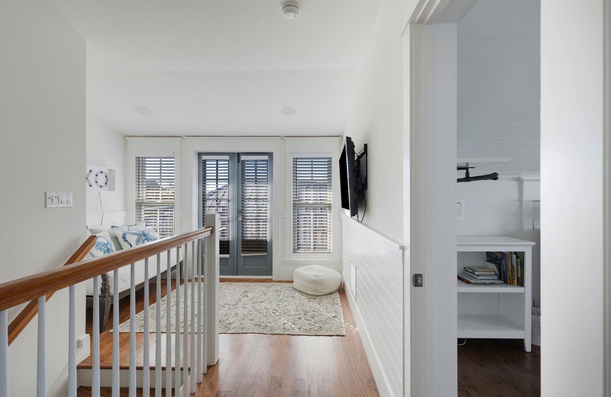 Taking the final steps to the third floor, you are led to a television room, where you can relax on the couch while your favorite movie plays or step out to the balcony which provides perfect views of the southern coastal sky. The third-floor guest room is equipped with two built-in twin beds and trundles underneath sleeping a total of four. The bedroom also has a comfortable chair, dedicated storage space, and a bookshelf for the little ones. The bathroom is adjacent to the guest room and features a walk-in shower. This is a perfect space for kids to enjoy.