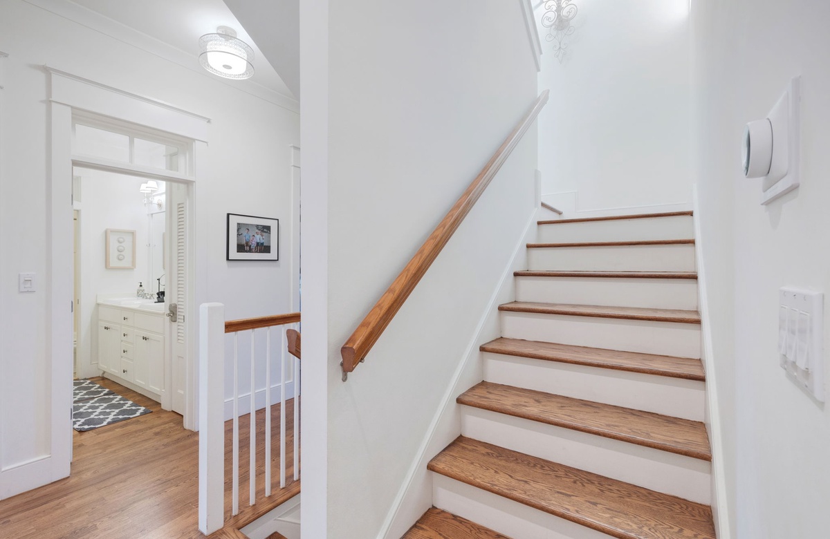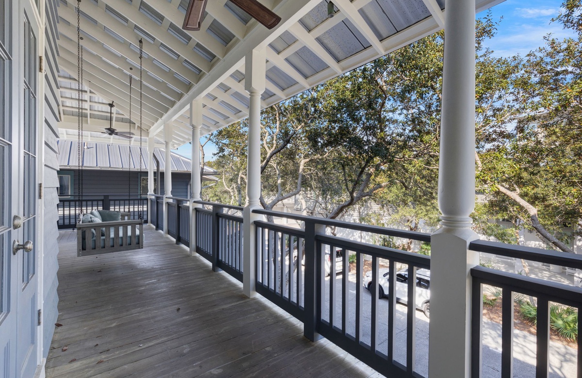 Moving back down the hall towards the front door is where the stairs leading up to the bedrooms are located. The second floor hosts the master bedroom and bathroom, two guest rooms, and a large balcony on the north side with a porch swing and comfortable outdoor seating. Vaulted ceilings, a dedicated HVAC system, a large private balcony with seating, a private attached large bathroom, and a cozy king-sized bed create a luxurious master bedroom sanctuary. The suite also features comfortable seating, a dedicated workspace, and storage for your personal belongings. The ensuite bathroom hosts separate his and her vanity sinks, an armoire and closet space for your convenience, and a large shower and toilet space beautifully designed with shiplap walls and four showerheads. The master suite also features a dedicated private covered balcony with seating. In the hallway outside the master suite, a cozy seating area houses a Keurig coffee maker and mugs for mornings on the balcony sipping coffee– just in case making it down the stairs that early seems unmanageable.